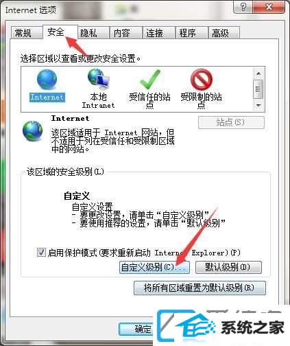 第二步、切换internet选项窗口至安详细板,点击底下自定义级别按钮;